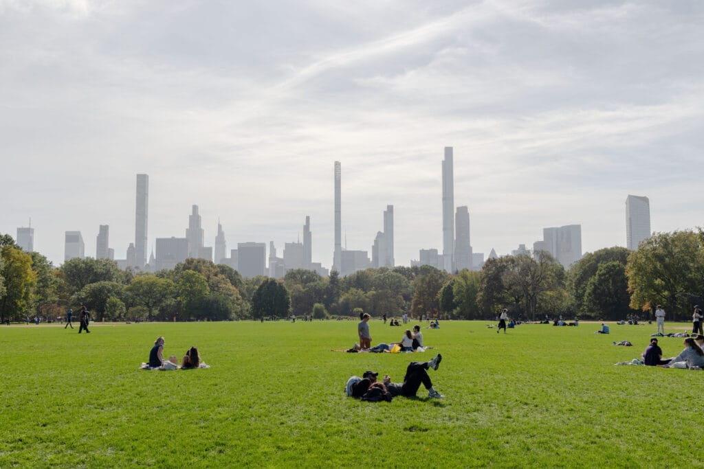 中央公园的大草坪,这次我们可以躺在草地上休息。周末好多人来玩棒球。草坪远处的摩天大楼,似乎是另一个星球的建筑。